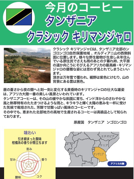 ☕10月のコーヒーは「タンザニア クラシック・キリマンジャロ」です。